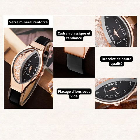 La versatilidad es un elemento clave de nuestro reloj y de nuestra caja. Cada pieza de este conjunto ha sido diseñada para adaptarse a diversos atuendos y ocasiones, brindando a cada mujer la oportunidad de personalizar su look según su estado de ánimo y estilo.